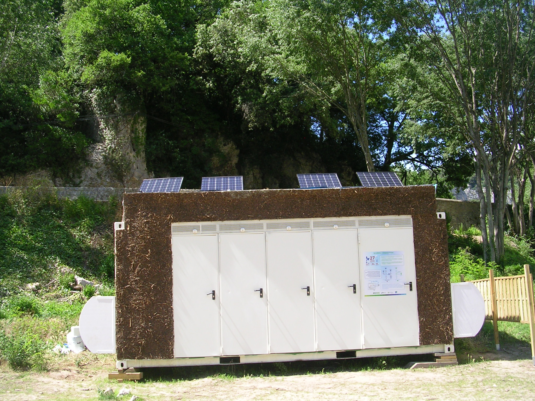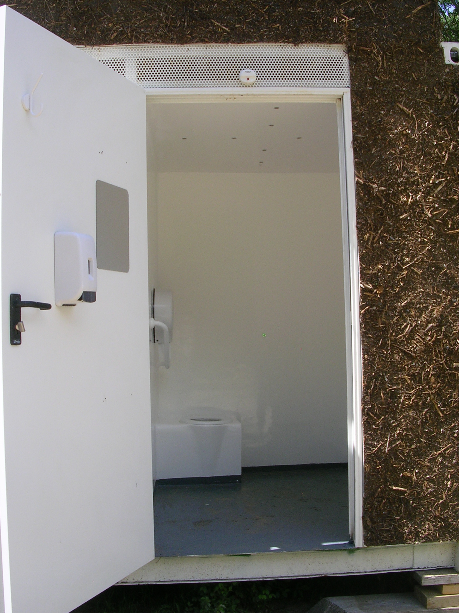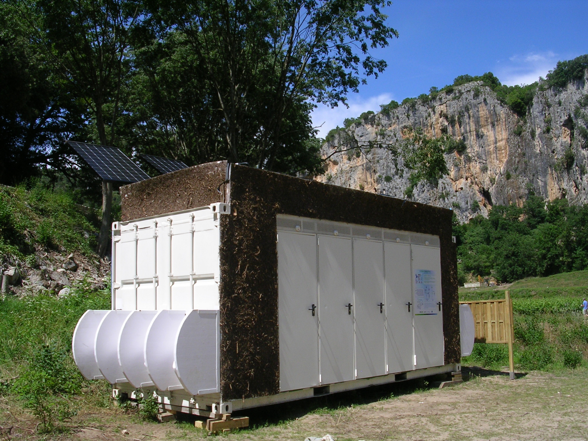 Avec son revêtement unique en bois et sa toiture végétalisée, la cabine s’intègre parfaitement sur le site de Pont d’Arc. Les 5 cabines et 8 urinoirs permettent de répondre à de fortes affluences ; et ce en toute autonomie grâce aux panneaux solaires et grandes réserves.