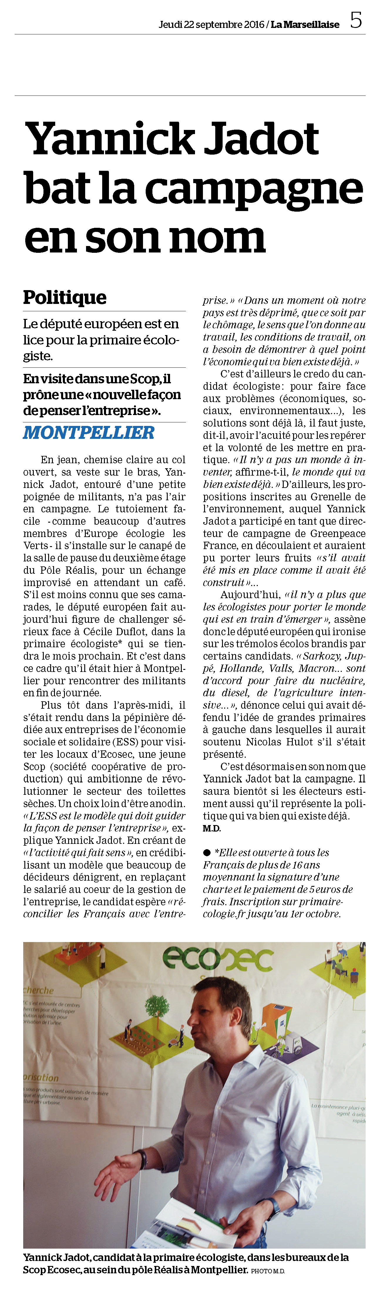 A l’occasion de la visite de Yannick Jadot dans nos locaux, La marseillaise a réalisé un article, nous les en remercions :